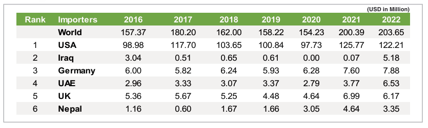 UAE: The UAE has demonstrated notable growth, with export values rising from $2.96 million in 2016 to $6.53 million in 2022, representing a growth rate of 14.1%. This substantial increase reflects the UAE’s growing market demand and India’s strengthening trade ties with the region.