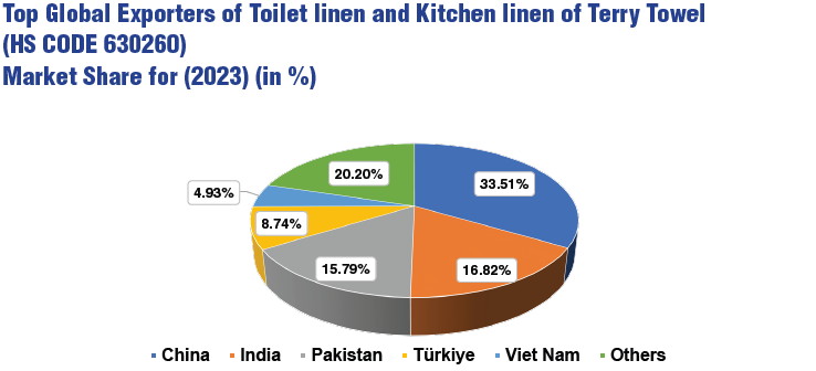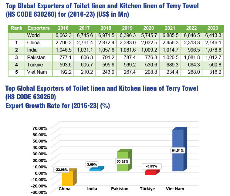 India’s Position :India has solidified its position as the second-largest global exporter of terry towels, with exports rebounding to US$ 1,078.8 million in 2023. India’s competitive pricing and a growing emphasis on sustainable and organic textiles have kept it strong in key markets like the USA and Europe. The country’s focus on innovation, eco-friendly products, and improved production capacity ensures its continued relevance in the global market. India’s textile sector benefits from government initiatives supporting exports and increasing global demand for high-quality Indian home textiles.