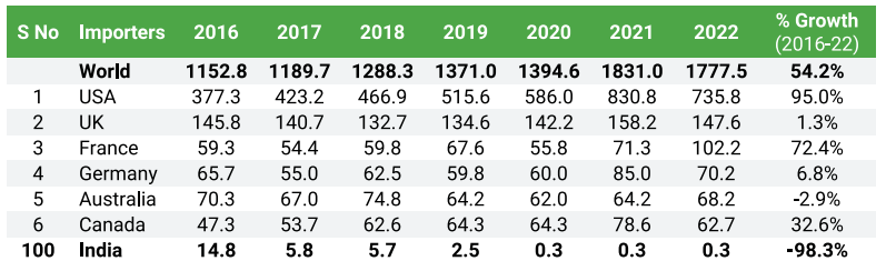Overview: The global imports trend from 2016 to 2022 shows a significant overall growth of 54.2%. The world’s total imports increased from $1152.8 million in 2016 to $1777.5 million in 2022. This growth trajectory, however, was not uniform across the years, with a notable spike in 2021 followed by a slight decline in 2022.