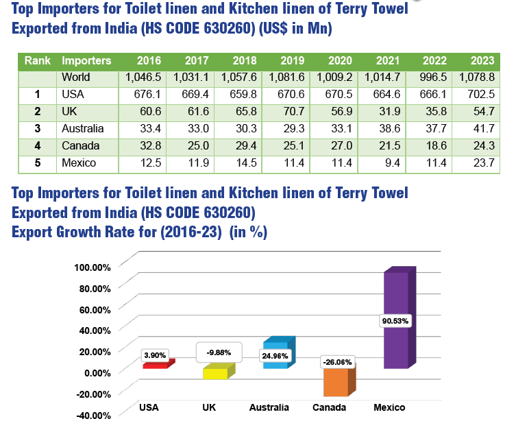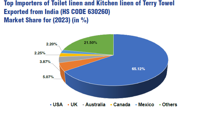 India’s export market for toilet and kitchen linen of terry towels has shown steady performance, reaching US$ 1,078.8 million in 2023. The USA remains India’s top importer, followed by the UK and Australia. Despite challenges during the pandemic, India has rebounded, with renewed growth and a strong focus on high-quality, sustainable products driving its exports.
