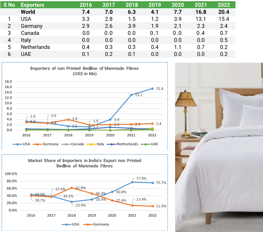 India’s position as an exporter of non-printed bedlinen of manmade fibres has strengthened, particularly in the US market. The significant growth in the US market share from 44.6% to 75.5% highlights India’s increasing dominance. In contrast, other major countries like Germany and the Netherlands have not shown such exponential growth, and new markets like Italy and Canada are only just beginning to show potential.