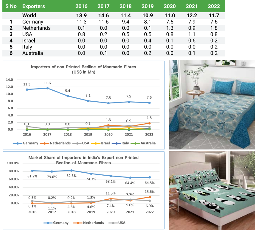 India’s export of printed bedlinen has seen Germany as its stalwart importer, though with a declining trend. The Netherlands appears to be a growing market, potentially offsetting some of the losses from Germany. The USA, Israel, Italy, and Australia represent smaller but consistent markets.