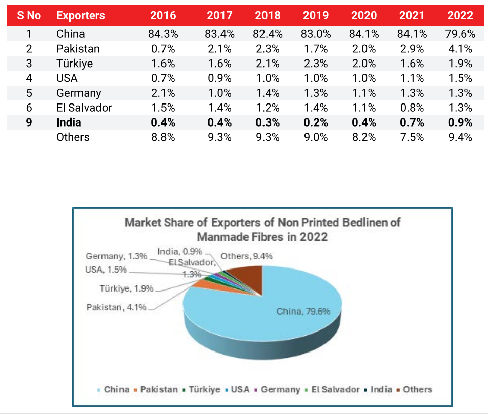 India exhibited a significant growth of 174.4%, increasing its market share from 0.4% to 0.9%. This growth, although on a smaller base, indicates India’s potential to become a more influential player in the bedlinen export market.