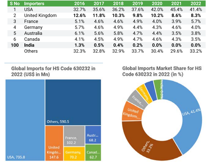 India imports of Non-Printed Bedlinen of Manmade Fibres have seen a decline of -98.3%, plummeting from $14.8 million in 2016 to a negligible $0.3 million by 2022. The steep decline suggests sufficient increase in manufacturing capabilities of the country, significant changes in domestic policies, market demand and supply chain disruptions. India’s dramatic fall could be due to India achieving self-sufficiency in manufacturing of the products, policy changes, economic challenges, or a shift towards self-reliance. The trends reflect the dynamic nature of global trade, influenced by economic policies, geopolitical events, market demands, and supply chain factors. Each country’s specific situation, such as policy changes, economic reforms, or shifts in trade agreements, likely contributed to the observed trends.