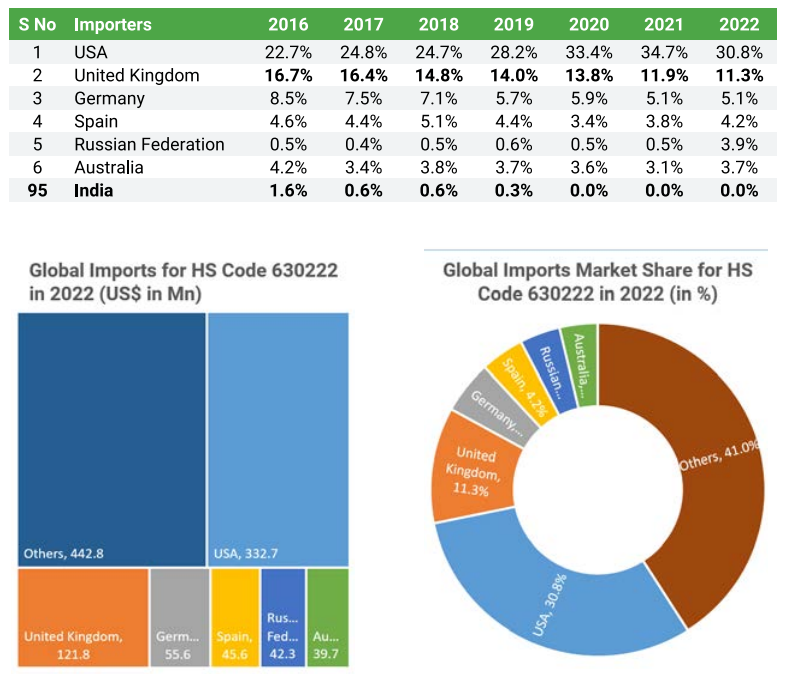 USA has demonstrated a strong growth in imports with a 55.6% increase, solidifying its position as the leading importer with a market share peaking at 34.7% in 2021 before settling at 30.8% in 2022.