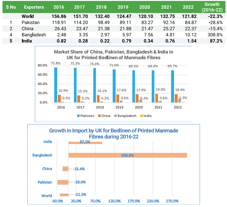 India’s Position and Comparative Analysis: India’s growth in the non-printed bedlinen market is noteworthy, indicating a potential shift in the UK’s sourcing strategy, possibly due to competitive pricing or quality improvements. In the printed bedlinen market, India’s growth is positive but still lags behind other major exporters.