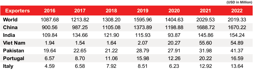 Vietnam: Vietnam emerged as a significant player, especially noticeable from 2020 onwards. The export value surged dramatically from $1.94 million in 2016 to $54.89 million in 2022, with a staggering growth rate of 74.6%. This exponential growth highlights Vietnam’s increasing capacity and competitiveness in this market.